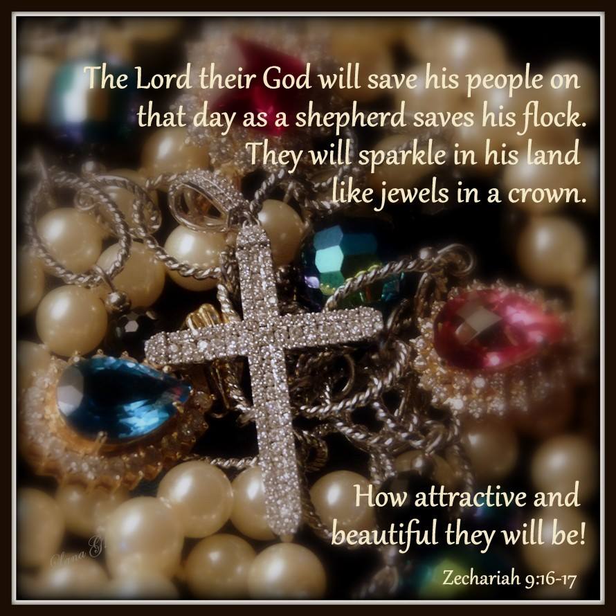 「當那日,耶和華他們的神必看他的民如群羊,拯救他們;因為他們必像冠冕上的寶石,高舉在他的地以上(或作:在他的地上發光輝)。」(16)