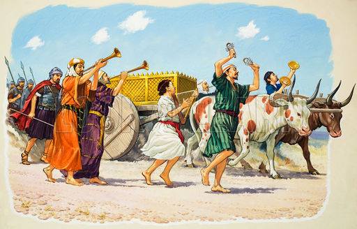「大衛和抬約櫃的利未人,並歌唱人的首領基拿尼雅,以及歌唱的人,都穿著細麻布的外袍;大衛另外穿著細麻布的以弗得。這樣,以色列眾人歡呼吹角、吹號、敲鈸、鼓瑟、彈琴,大發響聲,將耶和華的約櫃抬上來。」(27-28)