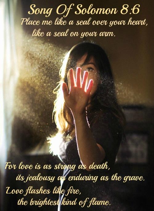 「求你將我放在你心上如印記,帶在你臂上如戳記。因為愛情如死之堅強,嫉恨如陰間之殘忍;所發的電光是火焰的電光,是耶和華的烈焰。愛情,眾水不能息滅,大水也不能淹沒。若有人拿家中所有的財寶要換愛情,就全被藐視。」(8:6-7)