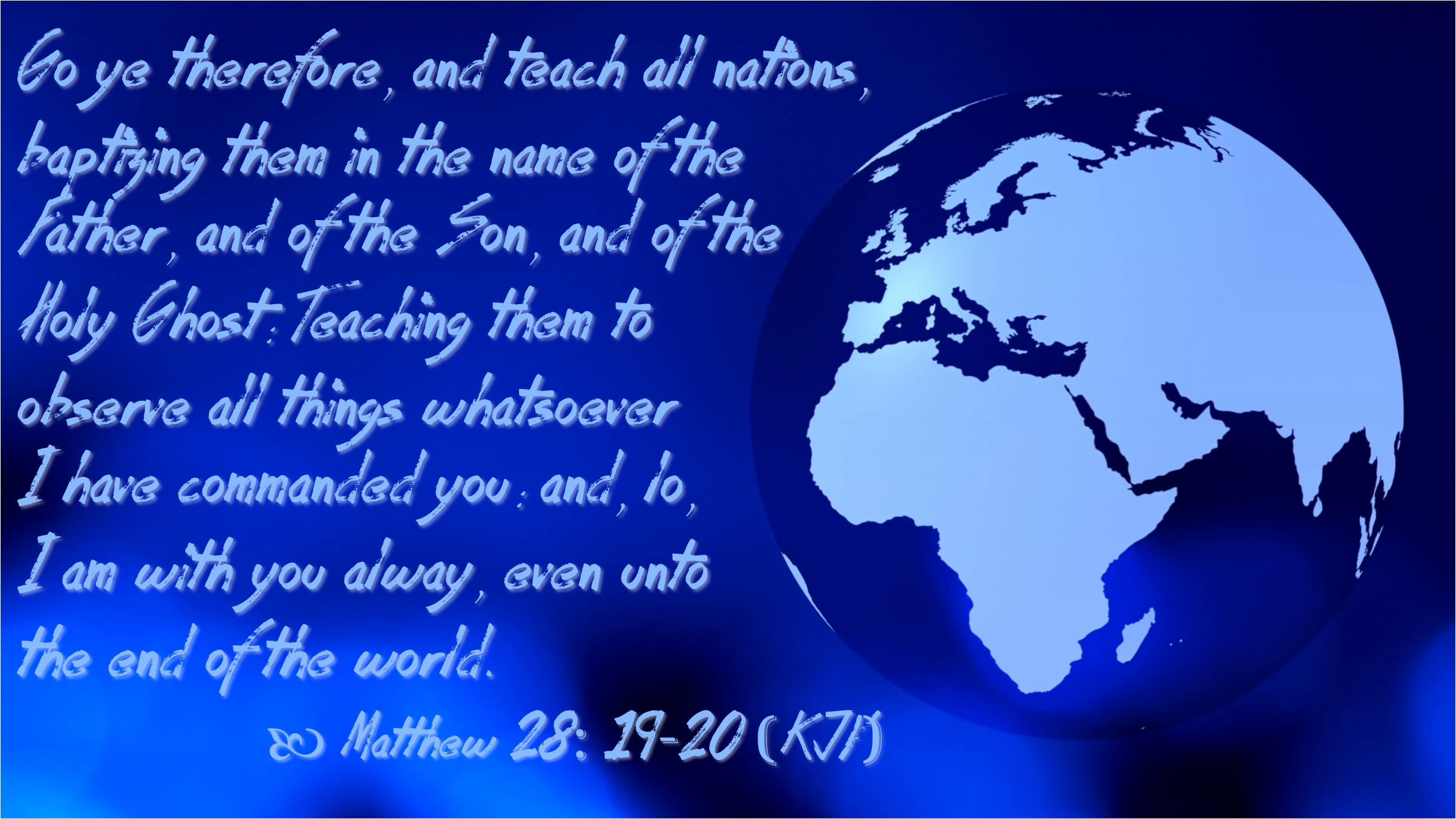 「耶穌進前來,對他們說:「天上地下所有的權柄都賜給我了。所以,你們要去,使萬民作我的門徒,奉父、子、聖靈的名給他們施洗(或作:給他們施洗,歸於父、子、聖靈的名)。凡我所吩咐你們的,都教訓他們遵守,我就常與你們同在,直到世界的末了。」(18-20)